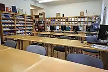 The library provides informational, librarian, rental, bibliographical and search services. It cooperates with a number of Czech but mainly with foreign professional libraries and informational institutions. At the end of 2016 it contained over 84 600 books and yearbooks and 419 journals.[31] Full texts of many of the journals are available via paid databases (EBSCO, JSTOR, WoS).[32] The library is a member of the European Information Network on International Relations and Area Studies (EINIRAS) and it also participates in the project Knihovny.cz.[33]