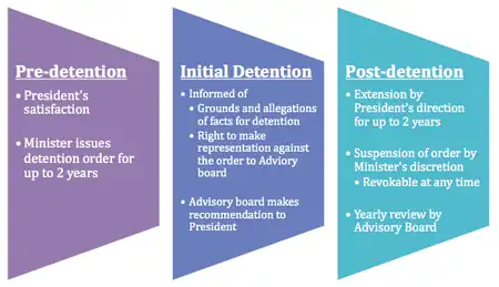 The initial order of the Minister for Home Affairs may direct that an individual be detained for up to two years.[31] This may be further extended by directions issued by the President for further periods of up to two years at a time.[49] The Minister is empowered with discretion to suspend a detention order, but also has the authority to revoke the suspension at any time, which reactivates the detention order.[50] Detention orders must be reviewed at least once every 12 months by an advisory board which thereafter makes its recommendation to the Minister.[51] If an advisory board recommends the release of a detainee and the Minister disagrees, the President may exercise personal discretion to order the release.[52] The requirement for regular reviews of detention orders does not apply to detainees who are not citizens.[53] When a detention order is extended, the Minister is not required to provide the detainee with the grounds justifying the extension order or give the detainee an opportunity to appeal against the extension.[54]
