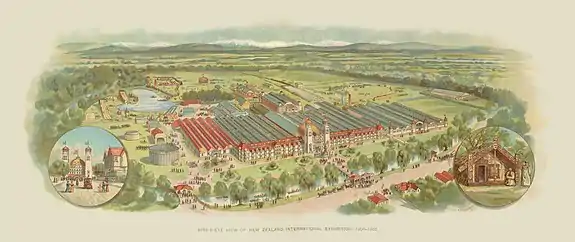 The New Zealand International Exhibition (the biggest in the country to that time) opened on 1 November 1906 in Hagley Park, Christchurch, New Zealand. Nearly two million people visited the exhibition during the next few months.[1]