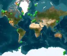 The International Tundra Experiment (ITEX) is a long-term international collaboration of researchers examining the responses of arctic and alpine plants and ecosystems to climate change.[1] Researchers measure plant responses to standardized, small-scale passive warming, snow manipulations, and nutrient additions. Researchers use small open-top chambers (OTCs) to passively increase mean air temperature by 1-2 °C.[2] The ITEX approach has been validated by tundra responses at the plot level.[3] The network has published meta-analyses[4][5][6] on plant phenology, growth, and reproduction,[7] composition and abundance,[8] and carbon flux.[9] The ITEX network consists of more than 50 sites in polar and alpine locations around the world.[10]