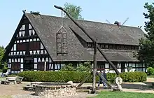 The Rossmühle is probably the largest horse mill (Pferdemühle) in Germany and comes from Hüllhorst-Oberbauerschaft in the district of Minden-Lübbecke. The original was built in 1797 and this replica erected in 1982. It is an octagonal timber-framed building. In the interior, horses walked around in a circle turning a wooden cogwheel with a power of one horsepower (PS) each. The cogwheel, with its 320 teeth and diameter of 32 metres, is the largest known of its type. It drove a stamping mill, used in the production of flax, and a corn mill.