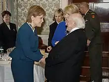 Additionally, First Minister Nicola Sturgeon became the first serving head of a foreign government to address the upper house of the Irish Parliament, the Seanad, during a two-day state visit to Ireland in 2016.[32] During the two day visit, Sturgeon met with President of Ireland Michael D. Higgins and foreign affairs minister Charlie Flanagan. In her address to the Irish Parliament, Sturgeon said that "the shared history between Scotland and Ireland had created inextricable links and a bond of mutual co-operation that a consequence of Brexit in Scotland was an even sharper focus on social justice", further adding "although we share more than a thousand years of history, I hope and believe that relations between Scotland and Ireland are now stronger, warmer and more harmonious than they have ever been".[33]