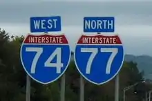 The 12.6-mile (20.3 km) portion from south of Steeds north to south of Ulah was completed August 27, 1996, and was the first road marked as I-74 (and I-73).[34] Future signage was also installed north to the Greensboro area.[35] The remainder of the 26 miles (42 km) of existing and new freeway between Ulah and Candor was also signed as I-73/I-74 along US 220. In 1998, NC 752, a freeway spur of I-77 was renumbered as the segment of completed I-74, from I-77 to US 601. On June 30, 1999, the freeway was extended an additional five miles (8.0 km) to US 52, south of Mount Airy. In April 2001, I-74 was overlapped with I-77 from the Virginia state line to exit 101.