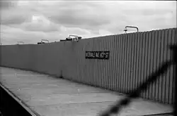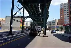 The city government took over the IRT's operations on June 12, 1940.[13][14] The Bergen Avenue cutoff, which allowed Third Avenue trains to access the White Plains Road Line, was abandoned on November 5, 1946, as part of the gradual curtailment of elevated service on the IRT Third Avenue Line.[6] On June 13, 1949, the platform extensions at this station, as well as those on White Plains Road Line stations between Jackson Avenue and 177th Street, opened. The platforms were lengthened to 514 feet (157 m) to allow full ten-car express trains to open their doors. Previously the stations could only accommodate six-car local trains.[15]