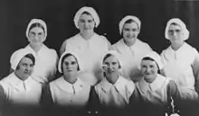 Group of Ipswich Hospital nursing students, ca. 1930. The students included in the back row from left to right: Jean McLelland (POW in Japan for three years during World War II), Ruth Robson, Sylvia Rudd, Elsie Spencer. In the front row from left to right were: Elaine Jones, Frances Leetch, Mavis Munsell, and Rita Cooney.