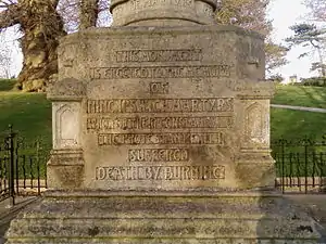 A memorial to the martyrs was erected in Christchurch Park in 1903, a short distance from Christchurch Mansion. It can be found by walking from the front of the mansion towards the children's play area. The monument has a square, stone base that bears a testament to the martyrs on the front, and lists their names on the other three sides. It was designed and executed by the Art Memorial Company of West Norwood, and is 27 ft (8.2 m) high and 10 ft 6 in (3.20 m) square at the base. The base is of Ketton stone, and the shaft of polished red granite.