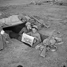 Men of the 2nd Royal Inniskilling Fusiliers reading Ireland's Saturday Night in their foxhole in the Anzio bridgehead, 17 March 1944