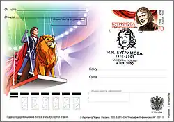 Irina Nikolayevna Bugrimova (March 13, 1910 – February 20, 2001) was the first female lion tamer in the Soviet Union. Called a "circus legend" by sources such as the BBC,[1] Bugrimova was the first woman in Russia and the then-Soviet Union to work with lions, tigers, and ligers in a variety of performing acts,[2] and trained more than 70 big cats during her career.[3]