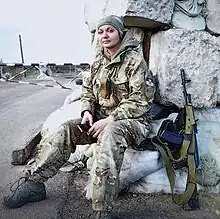 In 2014, she volunteered during the war in Donbas for the Sich Battalion. She later served for the Ukrainian Army's National Response Guard Brigade.[1] During the Dignity Revolution and the Russo-Ukrainian War, she devoted herself to photography, holding a personal exhibition in the village of Sviatopetrivske in 2017. She was also involved in writing,[2] participating in the publication of the book Voices of War. Stories of Veterans.[1][3]