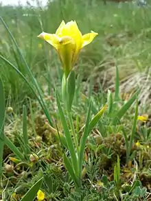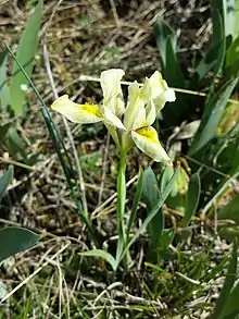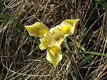 Sandy iris, or sand iris[2] (Iris arenaria), is a species in the genus Iris; it is also in the subgenus of Iris and in the Psammiris section. It is a rhizomatous perennial, from Central Europe, found in Hungary, Austria, Romania, Czech Republic and Ukraine. It has grass-like leaves, a short stem and pale yellow flowers. It has had a mixed origin and was once Iris humilis subsp. arenaria, a subspecies of Iris humilis (another Psammiris iris), until it was reclassified as a separate species. But many sources still state that it is either a synonym or subspecies of Iris humilis. It is cultivated as an ornamental plant in temperate regions.