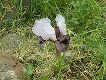 Like other irises, it has 2 pairs of petals, 3 large sepals (outer petals), known as the 'falls' and 3 inner, smaller petals (or tepals), known as the 'standards'.[8][17] The falls are obovate and very recurved,[5] and they measure 6.5–8.5 cm (3–3 in) long and 4.5–6.5 cm (2–3 in) wide.[5] The colour and thickness of the veining or speckling can vary.[11] In the centre of the petal is a signal patch, which is orbicular (round), purple-brown,[10][11][15] or almost black,[9] and 1.2 cm long and 1.5 cm wide.[5] Also in the middle of the falls, a row of short hairs called the 'beard', which is sparse and has purple brown,[5][10][11] or almost black hairs.[9] The standards are sub-orbicular and they measure 6.4–8.5 cm (3–3 in) long and 5.5–7.5 cm (2–3 in) wide.[5] They are paler than the falls.[5][12]