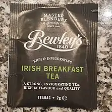 Irish breakfast tea is a blend of several black teas, most often a combination of Assam teas and Ceylon teas.[1][2] Irish tea brands, notably Barry's, Bewley's,[3] Lyons and Robert Roberts in the Republic and Nambarrie's and Thompson's Punjana in Northern Ireland are heavily weighted towards Assam. It is one of the most popular blended teas, common in tea culture in Ireland.[4] When tea was first transported from China to Ireland in the mid-18th century, it was mainly introduced to the wealthy as a result of its high cost and low demand.[5][6] However, throughout the mid-19th century, Irish breakfast tea became readily available to those of both lower and higher socioeconomic classes.[7]