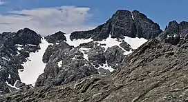 Iron Mountain is an 11,149-foot-elevation (3,398 meter) summit located in the Sierra Nevada mountain range in Madera County of northern California, United States.[5] It is situated in the Ansel Adams Wilderness, on the boundary shared by Inyo National Forest with Sierra National Forest. It is set at the south end of the Ritter Range, approximately 10 miles (16 km) west of the community of Mammoth Lakes. Devils Postpile National Monument is 4.5 miles to the east and the Minarets are three miles to the north. Precipitation runoff from the west side of this mountain drains to North Fork San Joaquin River, and from the east slope to the Middle Fork San Joaquin. Topographic relief is significant as the east aspect rises over 2,000 feet (610 meters) above Anona Lake in approximately one mile. There are climbing routes to the summit via the south slope and east face,[6] and inclusion on the Sierra Peaks Section peakbagging list generates climbing interest.
