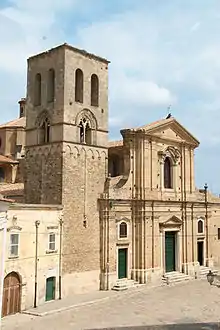 Irsina Cathedral (Italian: Cattedrale di Santa Maria Assunta, Duomo di Irsina), formerly Montepeloso Cathedral,[1] is a Roman Catholic cathedral dedicated to the Assumption of the Blessed Virgin Mary, located in Irsina in the region of Basilicata, Italy. Since 1977 it has been a co-cathedral of the Archdiocese of Matera-Irsina, and was previously, from 1818, a co-cathedral of the Diocese of Gravina-Irsina. Before that it was the seat of the Diocese of Montepeloso. The present building was constructed in the 13th century and remodelled in 1777. It has a Baroque façade and a Gothic campanile. It contains a baptismal font of red marble and a number of 18th-century paintings of the Neapolitan School.