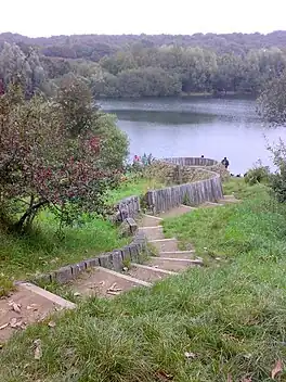 The Lookout was built by Tim Norris and Craig Ormerod in 2003, into the bank of the lake (Clifton Marina) at Clifton Country Park, to allow people access to the water and a quiet place to contemplate and rest. 53°32′08″N 2°20′49″W / 53.53567°N 2.346921°W