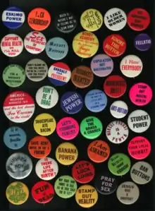 After a good response from the New York literary scene, Weisfeld began to mass produce some of his joke buttons and sell them through ads in magazines. Weisfeld's buttons caught on with "smart-aleck" college students and hipsters across the America.[12] Unlike "hippie" or "psychedelic" images that were featured on most 60s pin-on buttons, Weisfeld's buttons featured a design and fonts which showcased Weisfeld's irreverent and ironic copy writing. Among a large number of popular mid-1960s buttons Weisfeld created: "AMERICA: MURDER-MADNESS-SEX... and THE BEST DAMN ICE CREAM in the world", "DEATH IS NATURE'S WAY OF TELLING US TO SLOW DOWN","KILL FOR PEACE", "SEX: THE BREAKFAST OF CHAMPIONS", "if it moves, fondle it", "SHAKESPEARE ATE BACON", "HERMAN MELVILLE EATS BLUBBER","SUPPORT MENTAL HEALTH or I'LL KILL YOU","HAPPINESS IS A NICE WARM PUSSY", "ANARCHISTS UNITE", "PLEASE BE KIND: I'M ONLY A LITTLE GIRL IN A STRANGE TOWN", "ESKIMO POWER", "SAVE WATER: SHOWER WITH A FRIEND", "IF IT'S LIQUID, I DRINK IT", "GREAT SOCIETY: NEW LEECH ON LIFE", "PILLS, PLEASE", "STAMP OUT FIRST MARRIAGES", "FRODO LIVES", "WOMAN SHOULD BE OBSCENE AND NOT HEARD", "I'M MANIC DEPRESSIVE: BE WARNED", "GOD IS ALIVE: HE JUST DOESN'T WANT TO GET INVOLVED", "YOU, I DON'T LIKE", "YOU STINK!", "MARY POPPINS IS A JUNKIE", and "WHERE IS LEE HARVEY OSWALD NOW THAT WE REALLY NEED HIM?".