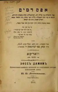Around this time, the Jewish community of Zaslavl in Volhynia was accused of ritual murder; many families were imprisoned, and the entire community was in despair. Levinsohn's opponents then laid aside their enmity and turned to him as the only man capable of proving the falsity of the accusation. In spite of his sickness Levinsohn began his Efes Dammim, in defense of the accused Jews. But the necessary means not being forthcoming, he was obliged to spend his own money in collecting material and information. "The purpose of my book," says Levinsohn, "is to acquit the Jews before the eyes of Christians, and to save them from the false accusation of using Christian blood." Efes Dammim is written in the form of a dialogue between a patriarch of the Greek Church in Jerusalem, Simias, and the chief rabbi in the Jewish synagogue there. The book shows the remarkable dialectic talent of the author. It was completed in 1834, published in 1837, republished three times, and was translated into English at the time of the "Damascus Affair" in 1840, at the instance of Sir Moses Montefiore and Adolphe Crémieux. It was translated also into Russian (1883) and German (1884; another German edition appeared in 1892). Another polemical work, Yemin Tzidki, Levinsohn proves the absurdity of the accusations against Judaism and the Talmud. This work was left by him in manuscript.