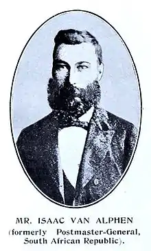 Dr. Isaac Van Alphen was Postmaster General during the Transvaal Second Republic,[1] appointed on April 1, 1885.