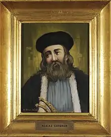 He was born in Desfina, Phocis, in a house near the church of Agios Charalambos in 1769[1] and was baptized Elias, the third child of the family of the priest Papa-Stathis and Archontos. His brothers were named Giannis (who became a shepherd) and Theodosis, who became a monk at the Monastery of Saint Luke. At the age of 18 he was sent by his father to Amfissa to prepare for a religious life, serving close to the monk named Gerasimos Lytsikas.[2] In 1797 he became a monk in the Monastery of the Holy Forerunner of Desfina, taking the name of Isaiah and was ordained a deacon in the Monastery of Saint Luke.[3] He studied in Ioannina, near Kosmas Balanos and Athanasios Psalidas. In Ioannina he met Ali-Pasha, whom Isaiah's father saved, named Papa-Stathis around the middle of the 18th century, when he found him half-dead in a cave and treated him.[4] Promoted quickly Abbot, due to his young age, raised his interest from Patriarch Cyril VI of Edirne where he invited him in 1814 to Constantinople for training. There he met Patriarch Gregory V, but was also initiated into the Friendly Society, in 1818. In the same year he was ordained bishop where he took over as bishop of Salona after the death of Joachim, following the persuasions of local prelates and Ali's own.[5] Two years later he became a member of the Friendly Society, developing charitable activities, raising money and weapons which he stored in Salona.