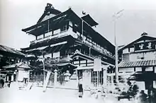 During the two years that Isaniwa Yukiya served as a mayor, he changed many things. First, he began charging money fora free outdoor hot spring for cures, because the hot spring was old, it needed to renew.[7] Then he rebuilt the hot spring for cures in 1892.[8] And then he planned to renew the main hot spring.[9] Yukiya planned Dogo Onsen to have third floor which was rare in those days for Japan, Japanese style mixed with European style building, red and blue Giyaman glass (Dutch style glass) used [10] and looks rich and powerful building, because the main hot spring had good quality, Yukiya didn't want to Dogo Onsen looks usual type of other buildings.[11] He asked Sakamoto Hachiro, a carpenter for castle, to make it and Sakamoto built it in 1894. It took for 20 months to build.[5] And he also founded Dogo train corporation and he asked to make the train rail to Dogo through Ichiban-cho in 1897, because Yukiya thought Dogo Onsen station[12] makes people come and visit to Dogo Yunomachi.[13] And in the same year, he made the park around the Dogo Onsen and for people to enjoy sweets, he made red and white Yuzarashi Dango, today's Botchan Dango. However, most people of the city disagreed with his these ideas until they saw the new Dogo Onsen.[14]