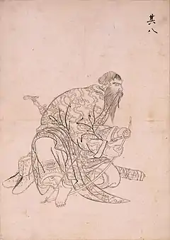 In 1788, merchant Hidaya Kyūbei (飛騨屋久兵衛) began commercial fishing operations in the Menashi-Kunashiri area, employing Ainu workers to catch salmon and trouth for use as fertilizer.[1]:77 Worked so hard that they had insufficient time to lay up food for the winter, food shortages combined with overbearing behaviour — including fishery supervisors making Ainu wives their mistresses — and suspicions of poisonings sparked the Menashi–Kunashir rebellion of May 1789.[1]:77 While local potentate Tsukinoe was away hunting sea otters on Uruppu, seventy-one Wajin were killed, twenty-two of them on Kunashiri, the rest in the Menashi area, all but one of them (a Matsumae Domain soldier) Hidaya employees.[1]:77 When news reached Matsumae at the beginning of June, daimyō Matsumae Michihiro despatched 260 soldiers, who made their way east, recruiting local Ainu chieftains as they went.[1]:77 Arriving in the Nemuro area in July, over three hundred of those involved surrendered, and of the thirty-eight directly involved in the killings — including Tsukinoe's son Seppayabu — all but one (who had fled) were beheaded, their heads stored in salt.[1]:78 In the aftermath, Matsumae Michihiro commissioned the Ishūretsuzō series of portraits of twelve elders who had helped suppress the revolt.[4]:90