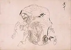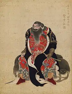 with his sanpaku eyes, he sits on bear[10]:158 or sea otter[11][1]:121 skins, his Ezo nishiki robe — with dragons, clouds, and waves, worn right over left — rides up, revealing his hairy legs; in his hands is an item of jewellery with tassels and beads[10]:158