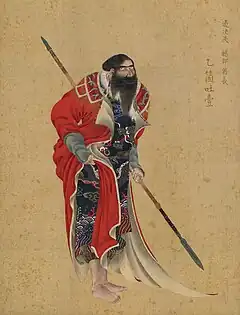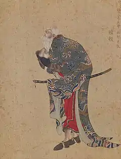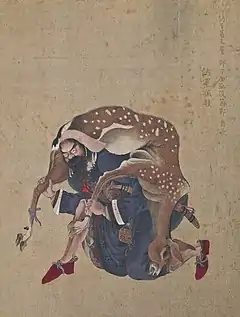 with European stockings and shoes under his fur-lined Ezo nishiki robe,[4]:100 he wears blue bead and cloth tassel earrings and holds a hoe-shaped helmet ornament[1]:121 (as does the chieftain Tobu in Kakizaki Hakyō's 1783 portrait (see Gallery below))
