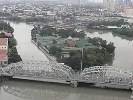 The island in the middle of the Pasig River with the Ayala Bridge in its foreground, looking due east