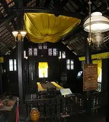 The guest hall of the istana is furnished with a cupboard that is made of carved wood with gold inlaid and complete with a mirror. The cupboard is used to store small decorative items. A hanging lamp is positioned from the ceiling, and a brass foot tray with legs is placed in the hall of visitors. Spread out is a mat made out of mengkuang leaves, a Malay feature to honour guests, and brass shields are mounted on the left and right walls. The kitchen of the istana is made from wood carved with floral motifs. Arranged on the table are a food cover made of woven mengkuang leaves and brass tray symbolising the pride and identity of the Malay race, together with a glass lamp. Kitchen utensils are stored in the cupboard.