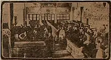 A court session of the Turkish courts-martial of 1919–20. CUP's leaders, Enver, Djemal, Talaat, among others, were ultimately sentenced to death under charges of wartime profiteering, and massacres of both Armenians and Greeks.[1][2][3]