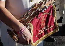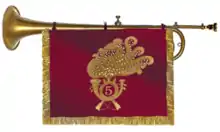 The instrumentation of the fanfara includes only brass instruments and does not contain any percussion or woodwind instruments. Valved bugles, which were made more popular by the bands, are the premier instrument used in the bands. The specific bugle that they employ in their performances is known as the Bersag horn, which was created before 1870 by Giuseppe Clemente Pelitti. Today, a modernized three-valved form, similar to the trumpet and the soprano bugle of the US drum and bugle corps, is used by the bands.[4] These horns carry the tabards of their specific regiments. Trombones, French horns, baritone horns, euphoniums and tubas are also used in the bands on a smaller scale.[5][6]