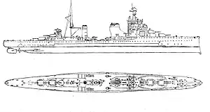 In the aftermath of World War I, the Italian Regia Marina (Royal Navy) received a group of light cruisers from the defeated German and Austro-Hungarian fleets. At the time, the Italian naval command was satisfied with these vessels as a supplement to their existing scout cruisers in the immediate postwar era. After the French Navy began building twelve large destroyers of the Chacal and Guépard classes, the Italian command responded by ordering the four Giussano-class cruisers.[1] The Giussanos were intended to overpower the new French destroyers with superior armament and very high speed, at the expense of most armor protection.[2]