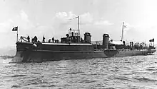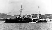 The primary armament for Tripoli was five 14 in (356 mm) torpedo tubes.[1] Two tubes were mounted in the bow and the other three were mounted in trainable deck launchers, one at the stern and two amidships.[4] She was also equipped with one 4.7-inch (120 mm) 32-caliber (cal.) gun for use against enemy counterparts. Defense against torpedo boats was provided by a secondary battery of six 57 mm (2.2 in) 43-cal. guns, two 37 mm (1.5 in) 20-cal. guns, and three 37 mm revolving Hotchkiss guns, all mounted singly. In 1904, the ship was rearmed with a single 3 in (76 mm) 40-cal. gun, six 57 mm 40-cal. guns, one 47 mm (1.9 in) 40-cal. gun; two of the torpedo tubes were removed. In 1910, Tripoli was converted into a minelayer; the remaining torpedo tubes were removed and equipment to handle 64 mines was installed. A second 3 in gun was added and all of the light guns were removed with the exception of four of the 57 mm guns. The ship was protected with an armored deck that was 1.5 in (38 mm) thick.[1]