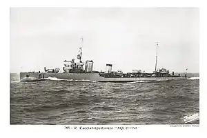 Aquilone was laid down by Odero-Terni-Orlando at their Genoa-Sestri Ponente shipyard on 18 May 1925, launched on 3 August 1927 and completed on 3 December.[1] Upon her completion, Aquilone, together with Turbine, Nembo and Euro was assigned to the 2nd Squadron of the I Destroyer Flotilla based at La Spezia.[5] Between 1929 and 1932 she carried out several training cruises in the Mediterranean.[6] In 1932 during the training exercises she launched and accidentally hit Zeffiro with a torpedo, but fortunately no damage was done as torpedo proved to be defective.[7] In 1931 Aquilone together with Turbine, Ostro and Borea as well as older Daniele Manin, Giovanni Nicotera and Pantera formed 1st Destroyer Flotilla, part of II Naval Division.[8] In 1934 after another reorganization Aquilone as well as Nembo, Euro and Turbine were again reunited, now forming the 8th Destroyer Squadron, part of II Naval Division.[9]