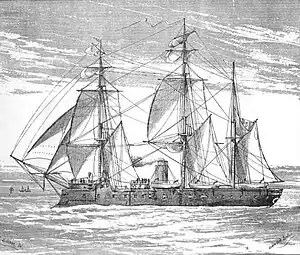 For the rest of her long career, San Martino served in a variety of roles, both in the main fleet and in Italy's colonial empire.[11] After the war, the Italian government slashed the naval budget so significantly that the fleet had great difficulty in mobilizing its ironclad squadron to attack the port of Civitavecchia in September 1870, as part of the wars of Italian unification. Instead, the ships were laid up and the sailors conscripted to man them were sent home.[12] Some time after 1866, the ship was rebuilt as a central battery ship, with most of her guns located in a central, armored casemate. Two other guns were placed in the bow as chase guns, with a third mounted as a stern chaser. At this time, her armament was also revised, to two 220 mm (8.7 in) guns in the bow and nine 8 in guns, four on each broadside and the last in the stern.[1] By October 1871, the ship was stationed in La Spezia, along with her sisters Regina Maria Pia and Castelfidardo, Affondatore, and the new ironclad Roma.[13] In August 1873, San Martino, Roma and the paddle steamer Plebiscito visited Barcelona, Spain. where they met a number of other foreign warships, including the French ironclad Jeanne d'Arc, the British ironclad HMS Pallas and corvette Rapid, and the United States frigate USS Wabash. San Martino had moved to Valencia in September.[14]