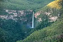 The Itiquira Falls is a waterfall in Brazil. They are located 34 kilometers north of Formosa in the state of Goiás and 115 kilometers from Brasília on a paved road.[1] The falls have a height of 168 meters, making them possibly the highest accessible waterfall in Brazil and the second highest overall. The falls are formed by the drop of the Itiquira River from the higher central plateau north of Formosa into the deep Paranã River valley. The waters are unpolluted and a bottling plant is located on the river above the falls (access from a different road heading north from Formosa towards Planaltina de Goiás).