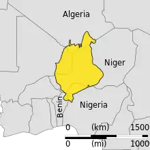 The Iullemmeden Basin (Berber language: Iwellemmedden) is a major sub-Saharan inland basin in West Africa, extending about 1,000 kilometres (620 mi) north to south and 800 kilometres (500 mi) east to west. It covers western Niger and parts of Algeria, Mali and Nigeria. It is named after the Iullemmeden, a federation of Tuareg people who live in the central region of Niger.[1] Its geographic range is largely coincident with the Azawagh region.[2]
