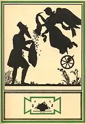 Not all the fables confined themselves to speaking animals and one humorous human subject fitted the kind of genre paintings of peasant interiors by those from the emerging Realist school. This scenario was "Demyan's Fish Soup", in which a guest is plied with far more than he can eat. Two of those who took the subject up were Andrei M.Volkov (1829-1873) in 1857,[30] and Andrei Popov (1832–1896) in 1865 (see left). Illustrated books, on the other hand, have been numerous and at the start of the 20th century the style of other new art movements were applied to the fables. In 1911 Heorhiy Narbut provided attractive Art Nouveau silhouettes for 3 Fables of Krylov, which included "The beggar and fortune" (see below) and "Death and the peasant". A decade later, when the artistic avant-garde was giving its support to the Russian Revolution, elements of various schools were incorporated by Aleksandr Deyneka into a 1922 edition of the fables. In "The cook and the cat" it is Expressionism,[31] while the pronounced diagonal of Constructivism is introduced into "Death and the peasant".[32]