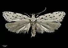 ♀. 32 mm. Head and thorax white. Palpi white, basal half of second segment externally black, also an obscure blackish ring near apex, terminal segment with a sprinkling of black scales forming an indefinite ring at tooth. Antennae fuscous mixed with white, basal segment paler. Abdomen ochreous-whitish, apical segment brown. Legs grey-whitish, tarsi banded with dark fuscous. Forewings elongate, broad, costa well arched, apex obtuse, termen rounded, oblique; white, densely irrorated with pale fuscous; seven blackish spots on costa, first at base, second at 1⁄4, third at 1⁄2, seventh at apex, and remaining three at equal distances between third and seventh; a blackish spot in disc obliquely beyond second costal, and a linear blackish mark on fold beneath this; three blackish spots forming a triangle in disc at about middle, the most apical obliquely beyond third costal; a less clearly defined spot towards apex; a series of blackish spots on termen: fringes white. Hindwings grey-whitish with an undefined dark discal spot: fringes grey-whitish. A very distinct form, larger and without the dark fasciae of the other white species.[3]