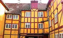 Olufsen experienced problems with his neighbours whose new houses and additions began to restrict his view of the harbor but he was successful in his ensuing legal action. Hamborggård, the long half-timbered residence to the south of Olufsen's stone house, was erected more or less at the same time as Olufsen's mansion. It was possibly built by Olufsen himself or his son-in-law, Christopher de Hemmer, who was mayor of Aalborg from 1630 to 1658 and inherited the entire property on Olufsen's death in 1645. At the beginning of the 19th century, the owner was Ludvig Stoustrup, a grocer. His son, Axel Stoustrup (born 1908), tells us that during his childhood there were five horses there and that during the First World War his family had a cow and hens. Niels Søndergaard, a licensed merchant, was also one of the property's owners. His and his wife's initials can be seen above the main doorway.[3]