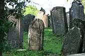 The graves are arranged in north–south direction, but it's not known why the orientation differs from those in other Jewish cemeteries. Men and women were buried in separate rows. Overall, more than 2,700 people are buried in the cemetery. In the oldest part of the cemetery, right next to the road, the grave stones are uniformly, carried out in the basic form of traditional steles. Most were made of the local sandstone, those of the wealthier families from shell limestone. From the mid-19th century, marble was increasingly used, and in addition to the usual Hebrew grave inscriptions also in German with Latin letters. Increasingly, the grave stones were made in the Neoclassical style and neo-Gothic shapes, also broken pillars for young deceased and obelisks were used. Since the mid-1940s, according to the spirit of the age, simple and uniform grave stone were used again. The inscriptions were also restricted to the bare minimum and carried out partly in Hebrew.[2]