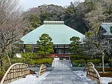 Tōkasan Jōmyō Zenji (稲荷山浄妙寺) is a Zen Buddhist temple of the Rinzai sect, Kenchō-ji school, in Kamakura, Kanagawa Prefecture, Japan. Jōmyō-ji is Number Five of the five temples known as Kamakura Gozan ("Kamakura's Five Mountains"), and the only one of the five not founded by a member of the Hōjō clan. Jōmyō-ji has instead, as nearby Zuisen-ji, deep ties with the Ashikaga clan, and was one of the family's funeral temples (bodaiji).[1] For this reason the family's kamon, or crest, is ubiquitous on its premises. The first three characters of its full name mean "Inari mountain", presumably from the hill of the same name where it stands, in its turn named after an ancient Inari myth (see below). Jōmyō-ji has given its name to the surrounding area, the characters for which have been however deliberately changed from 浄妙寺 to 浄明寺.[2]