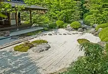 After the main gate (sanmon) in the middle of the temple's large garden stands the Main Hall (the Hon-dō, see photo above). Its structure is however not that of a typical Zen Butsuden, but rather that of an 8×6 bay (間, ken) hōjō (chief priest's living quarters) with raised floors.[2] Destroyed by fire in 1748, it was rebuilt in 1754 using in part original Muromachi period timber salvaged from the old edifice.[2] The main object of worship is a seated figure of Shaka Nyorai carved in wood during the Nanboku-chō period.[2] The temple also owns a seated figure of founding priest Taikō Gyōyū (the temple's only Important Cultural Property), a statue of goddess Shō-Kannon, another of Fujiwara no Kamatari (an ancestor of the Fujiwara clan), and one of Kōjin, the god of the kitchen and cooking.[2] The hōkyōintō in the cemetery behind the Hon-dō is said to be Ashikaga Sadauji's grave, but the attribution has been questioned by scholars because of the date it bears, sixty years after Sadauji's recorded date of death.[2] The temple includes a recently restored tea house called Kisen-an (喜泉庵) where monks used to meet to have tea, but which is now open to the public. In front of the tea house lies a karesansui, or Zen rock garden. On the premises there is also a restaurant and bakery owned and operated by the temple itself. Near the temple can be found the ruins of Daikyū-ji (大休寺), Ashikaga Tadayoshi's family temple (he was often called Daikyū-dono (大休殿)) where he was buried after he died.