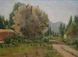 John B Fairbanks was born on December 27, 1855, in Payson, Utah. He was the first Latter-day Saint artist born in Utah territory.[2][3]: 49 His parents were John Boylston Fairbanks (1817-1875) and Sarah H. Van Wagoner Fairbanks (1822-1898).[4] His father was an early pioneer who had come to Utah from Winter Quarters in 1847[5]: 38 ; and died from pneumonia on May 14, 1875, leaving Fairbanks to care for the family.[4] Although he showed an early interest in art, he had no inclination to pursue it as a career until, in 1877, he visited the studios of John Hafen, an aspiring artist his own age.[4] Fairbanks would sit in Hafen's studio and watch him paint in between working in the field and playing baseball. He would hide his paintings and other works, because he did not want to disappoint his family. When he eventually showed a finished painting to his mother, she initially did not believe he painted it, but was proud of Fairbanks when his sisters confirmed that he had painted it.[6]: 92 Hafen became his lifelong friend and mentor.[7] Fairbanks would paint in the evenings and Saturdays.[6]: 92