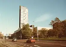 Womersley was an advocate of high rise living and it was seen as a solution to slum clearance, being raised at two major RIBA symposia in 1955 and 1957, where he suggested that 50% of the population wished to inhabit high-rise accommodation.[19] He determined that this would be the solution to the difficulties presented by the Sheffield specification and in order to do so, he established an imaginative and highly enthusiastic team, including Ivor Smith and Jack Lynn, committed to creating the good quality accommodation for people to live in. The city's topology, three main land masses containing steep escarpment, rolling plateau and a series of ridges, presented a challenge but allowed many of them to be visually related; "with the hilltop architectural compositions producing something of the fascination of the Italian hill towns" that had inspired Womersley in the 1930s.[20] The city centre, which, up until then had been neglected, with all council resources directed towards housing, was to be redeveloped under Womersley's department, including the Hole in the Road and the Castle Market, designed by Andrew Derbyshire with J. Stuart Mackie. The Castle Market was intended to form the cornerstone of a pedestrianised city centre which was as pioneering as Park Hill. Unfortunately it never progressed and the market was demolished in 2015.