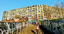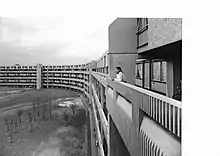 Following transformation of the two of Sheffield's central hills, Netherthorpe and Woodside, attention was turned to the third, Park Hill, which was to become the largest listed building in Europe. Commenting in Melvyn Bragg's Reel History of Britain,[24] Charlie Luxton describes it as, "one of Britain’s best examples of what modern council housing can be about. The idea was to create a sense of community with these streets in the sky… They invested in the infrastructure, they invested in the shops, the schools, the playgrounds". Park Hill's principal architects, Jack Lynn and Ivor Smith, were appointed almost straight from college without formal interviews.[25] Inspired by Le Corbusier’s Unite d’Habitation in Marseille they created these ‘streets in the sky’ on the steeply sloping land near the city centre. Every effort was made to establish a community feel – the decks, or ‘streets’, facilitating doorstep gossip and encouraging children to play ‘outside’. The streets, it is affectionately recalled, were wide enough for milk floats and tricycles and importantly separated man and child from traffic. Like the sheltered balconies of each flat, the decks provided magnificent views. They were given the street names of the original slums, Norwich, Long Henry and Hague, with previous neighbours housed close to one another as far as possible. Contained in the grounds were shops, schools, children's play areas, pubs, concierges and a police station. Womersley reflected on his team's architectural developments across Sheffield that: