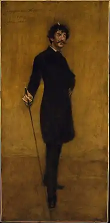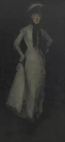 Whistler was not so successful a portrait painter as the other famous expatriate American John Singer Sargent. Whistler's spare technique and his disinclination to flatter his sitters, as well as his notoriety, may account for this. He also worked very slowly and demanded extraordinarily long sittings. William Merritt Chase complained of his sitting for a portrait by Whistler, "He proved to be a veritable tyrant, painting every day into the twilight, while my limbs ached with weariness and my head swam dizzily. 'Don't move! Don't move!' he would scream whenever I started to rest."[63] By the time he gained widespread acceptance in the 1890s, Whistler was past his prime as a portrait painter.[64]