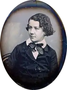 Whistler already was imagining an art career. He began to collect books on art and he studied other artists' techniques. When his portrait was painted by Sir William Boxall in 1848, the young Whistler exclaimed that the portrait was "very much like me and a very fine picture. Mr. Boxall is a beautiful colourist... It is a beautiful creamy surface, and looks so rich."[16] In his blossoming enthusiasm for art, at fifteen, he informed his father by letter of his future direction, "I hope, dear father, you will not object to my choice."[17] His father, however, died from cholera at the age of 49, and the Whistler family moved back to his mother's home town of Pomfret, Connecticut.[18]