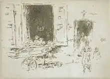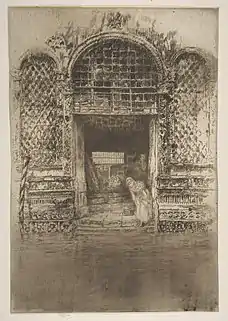 The etchings include portraits of family, mistresses, and intimate street scenes in London and Venice.[68] Whistler gained an enormous reputation as an etcher. Martin Hardie wrote "there are some who set him beside Rembrandt, perhaps above Rembrandt, as the greatest master of all time. Personally, I prefer to regard them as the Jupiter and Venus, largest and brightest among the planets in the etcher's heaven."[69] He took great care over the printing of his etchings and the choice of paper. At the beginning and end of his career, he placed great emphasis on cleanness of line, though in a middle period he experimented more with inking and the use of surface tone.[70]