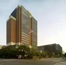 The William J. Green Jr. Federal Building (right) and James A. Byrne United States Courthouse (left), completed in 1973 and 1975, respectively.